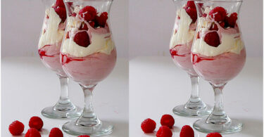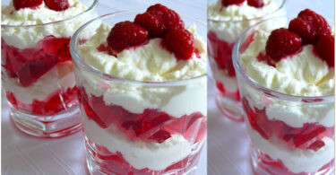 Dessert mit Gelee, Himbeeren und Mascarpone