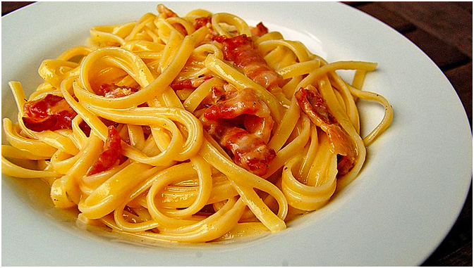 Mit einer kleinen Schöpfkelle etwas Nudelwasser aus dem Topf herausnehmen, beiseitestellen, dann die Nudeln in ein Sieb schütten. Nicht abschrecken! Die Nudeln sofort in die Pfanne mit dem Speck geben und gut durchmischen, etwas von dem Nudelwasser dazugeben. Die Pfanne vom Herd nehmen. Die Käse-Ei-Masse zu den heißen Nudeln geben und schnell durchmischen.